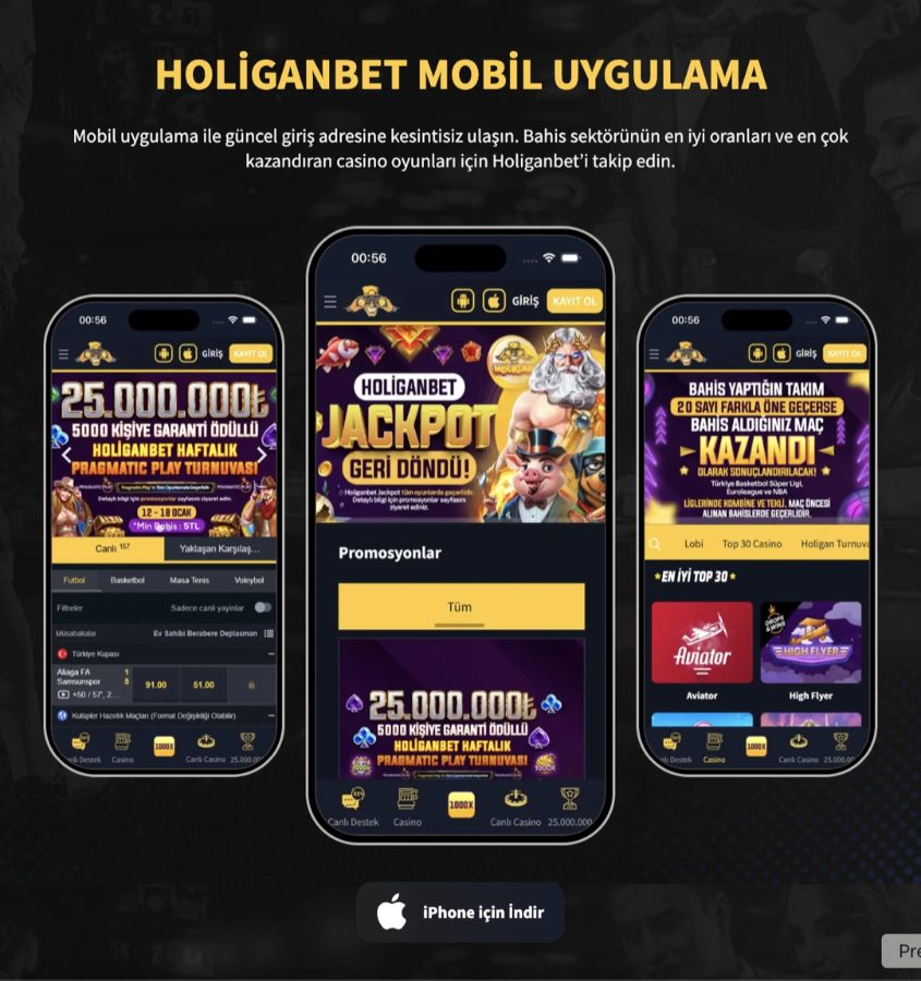 Holiganbet mobil uygulama hem iOS hem de Android işletim sistemli tüm akıllı telefonlar ve tabletlerle tam uyumludur. Tarayıcı üzerinden de mobil giriş yapılabilmekte; her iki seçenek de masaüstüyle özdeş hız ve güvenlik standartlarında çalışmaktadır.
